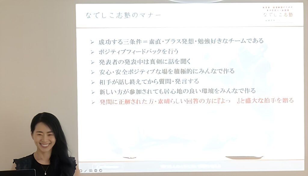 講座は毎回、なでしこ志塾のマナーを読み上げております。
