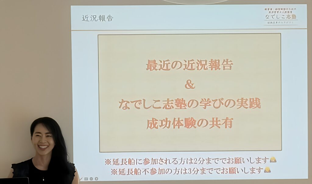 なでしこ志塾1期生の皆様は、現在3ヶ月に一度の開催ですので、最初に皆様の近況や学びの実践をご共有いただいております。