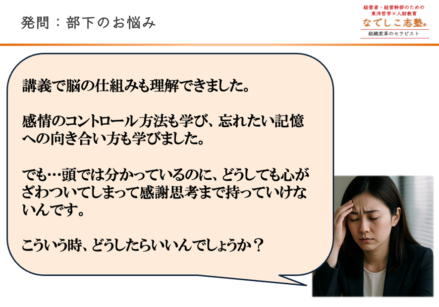 今回の講義では、忘れたい記憶や感情と、どう向き合えば心が静まり、どうすればリーダーとして他者にも寄り添えるのか。